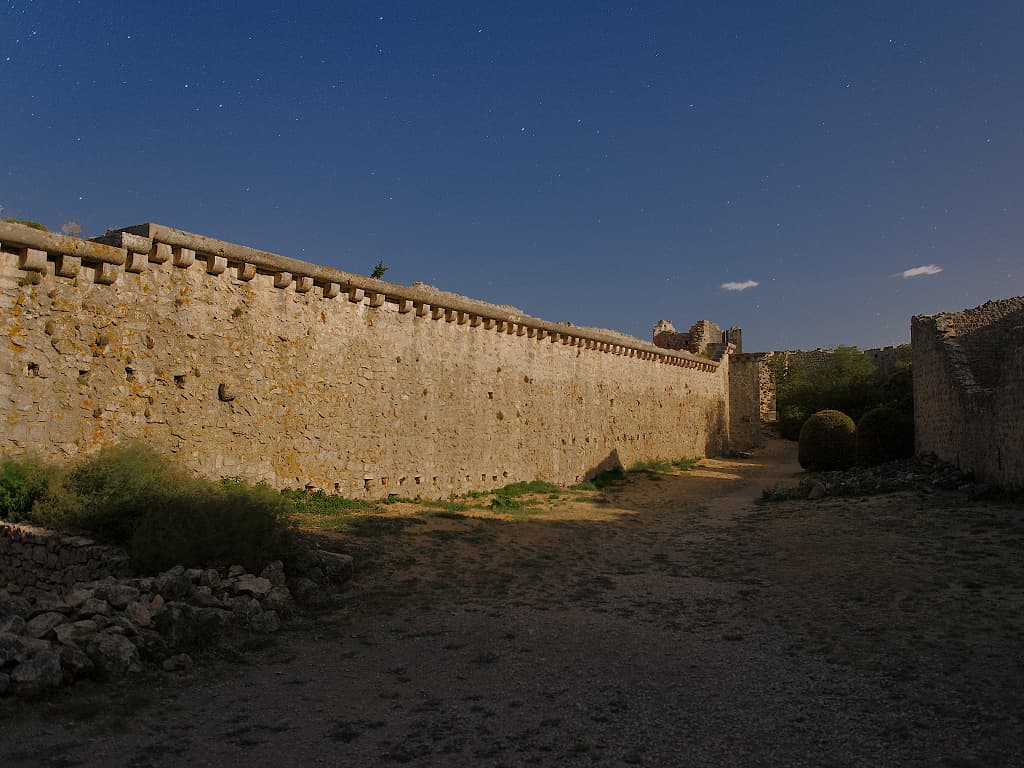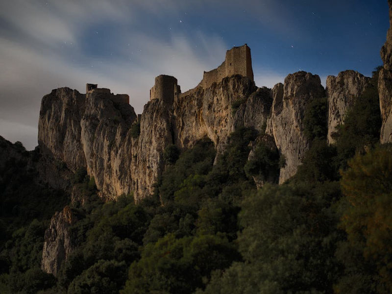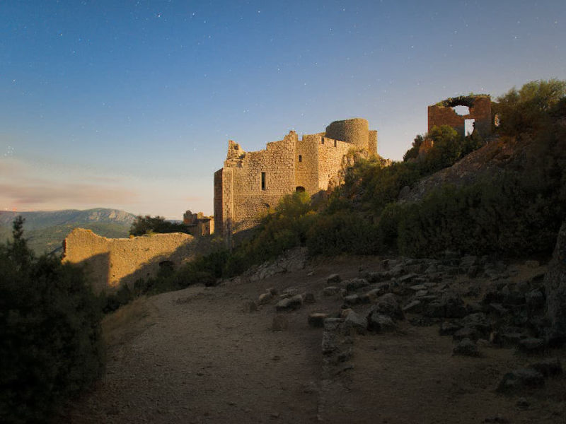 L’entrée nous conduit à la partie basse du château, avec son donjon massif et sa cour épousant la longueur du promontoire rocheux. Puis c’est au tour de la chapelle de Saint-Marie-de-Peyrepertuse dans laquelle je surprends mon accompagnateur en réalisant une photographie aussi éclairée qu’en plein jour... alors que la seule lumière de la lune éclaire discrètement le haut des murs de cet ancien espace religieux. La pose longue est devenue ma spécialité. J’arrive ainsi à capter des paysages et des couleurs que nos yeux ont du mal à distinguer… ou que nous n’avons pas l’habitude d’observer.